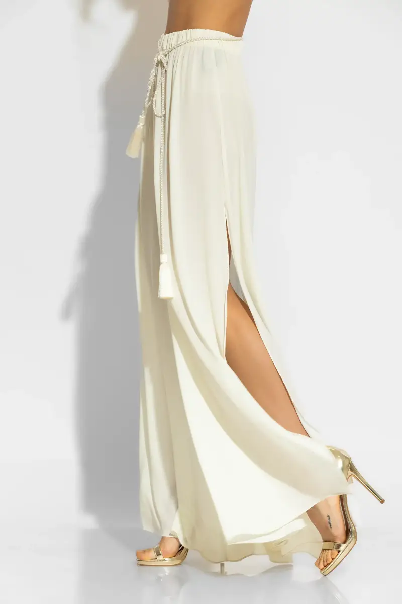 Τα πολύ φαρδιά, skirt-like μπατζάκια δημιουργούν έντονη κίνηση και χαρίζουν αέρινη ροή, ενώ τα πλαϊνά ανοίγματα προσθέτουν δυναμισμό και ευελιξία. Το crepe georgette ύφασμα προσφέρει απαλή υφή και ελαφριά διαφάνεια, ενώ παράλληλα αναδεικνύει τη θηλυκότητα με διακριτικό τρόπο. Μπορείς να το συνδυάσεις με το αντίστοιχο τοπ για ένα ολοκληρωμένο cocktail σύνολο, αλλά και να το φορέσεις ξεχωριστά για πιο ευέλικτα looks.