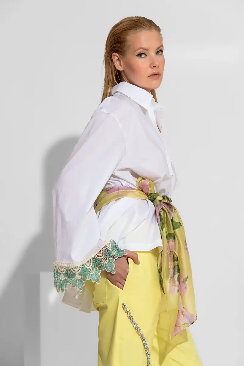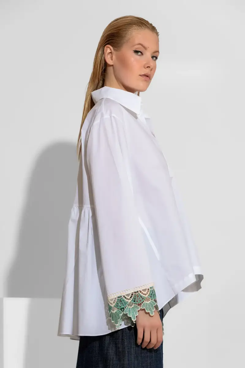 Το μήκος του πουκάμισου επιτρέπει πολλούς συνδυασμούς, είτε με παντελόνια είτε με κολάν ή ζώνη για πιο δομημένο αποτέλεσμα. Η λαιμόκοψη V ανοίγει διακριτικά το επάνω μέρος και προσθέτει θηλυκό χαρακτήρα στο σχέδιο. Τα μακριά μανίκια ολοκληρώνονται με δαντέλα στα τελειώματα, στοιχείο που δίνει ρομαντική λεπτομέρεια και αναβαθμίζει άμεσα το σύνολο.