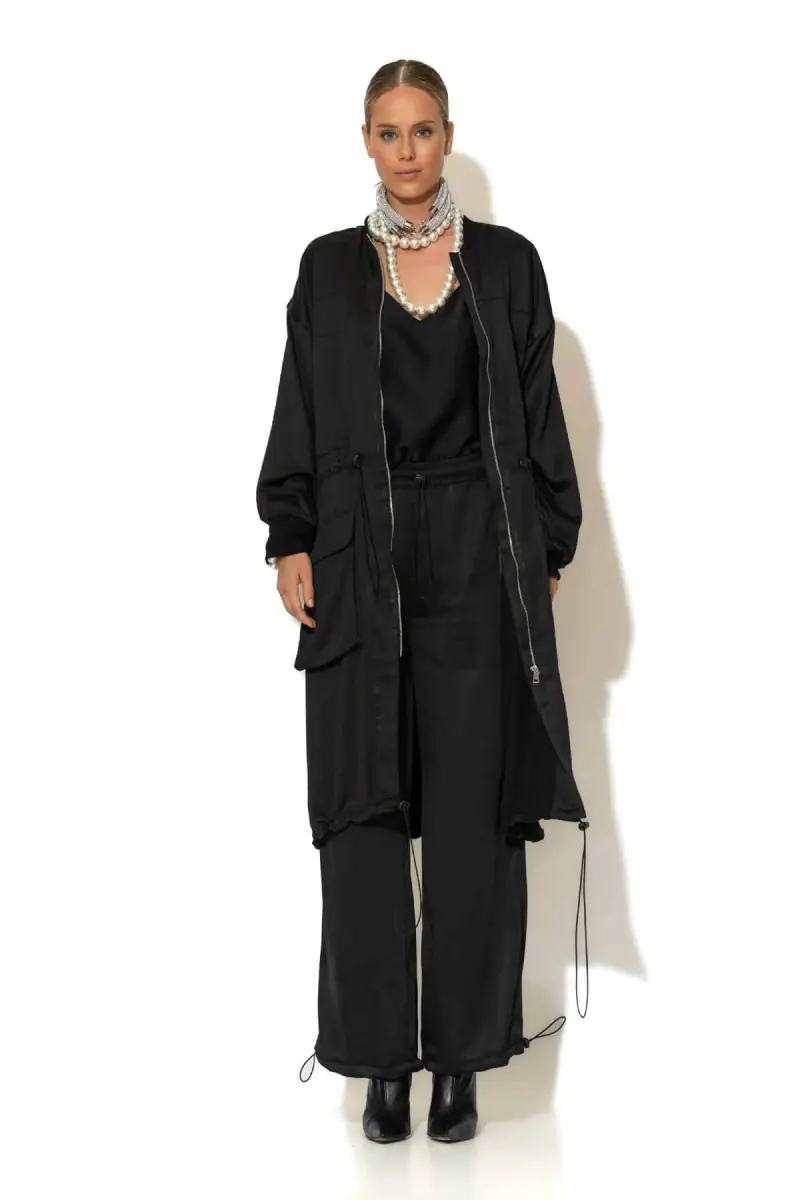 Το μεταλλικό φερμουάρ μπροστά προσθέτει μοντέρνο χαρακτήρα, ενώ ο ψηλός γιακάς με ριπ λεπτομέρεια δίνει δυναμικό ύφος. Το ρυθμιζόμενο κορδόνι στη μέση και στο τελείωμα επιτρέπει να προσαρμόσετε το παλτό ανάλογα με το σώμα και το προσωπικό σας στυλ. Οι μπροστινές τσέπες με φερμουάρ προσφέρουν πρακτικότητα και ασφάλεια.