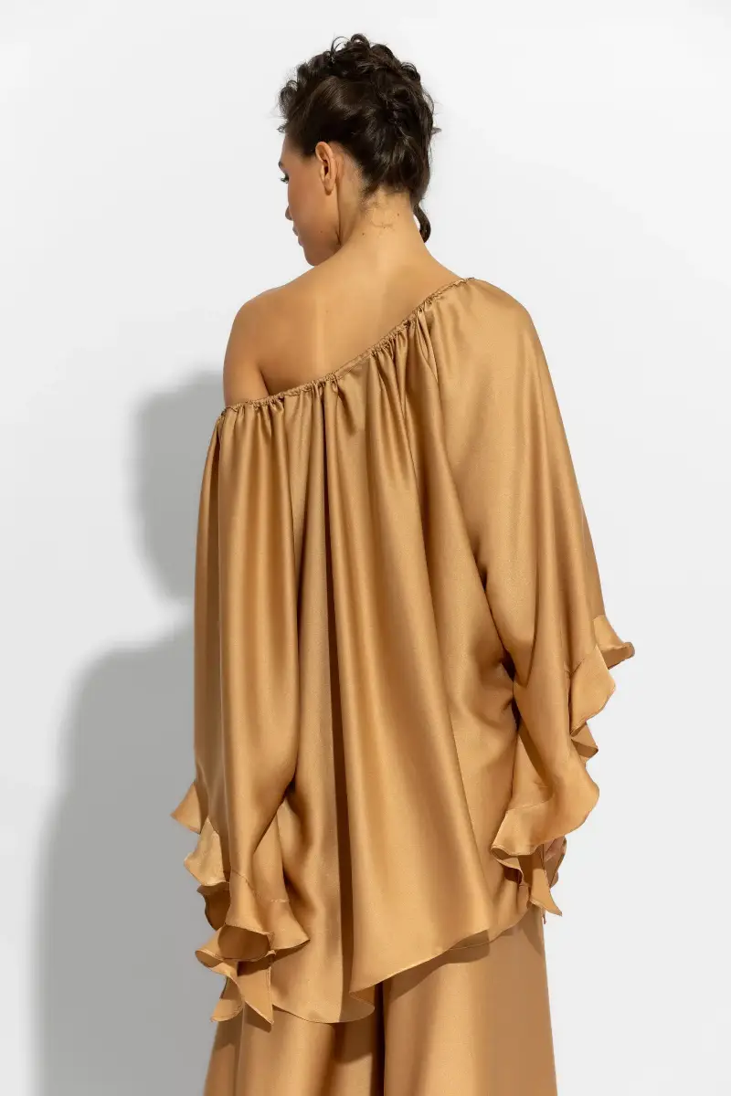 Τα εντυπωσιακά bell μανίκια με βολάν ενισχύουν τη δραματικότητα του σχεδίου και προσθέτουν χάρη σε κάθε κίνηση. Το σατέν ύφασμα αγγίζει απαλά το δέρμα και προσφέρει μεταξένια υφή, ενώ παράλληλα αναδεικνύει τη λάμψη του ρούχου. Μπορείς να τη φορέσεις σε resort εμφανίσεις, αλλά και σε επίσημες περιστάσεις, γιατί προσαρμόζεται εύκολα και αποπνέει κομψότητα σε κάθε περίσταση.