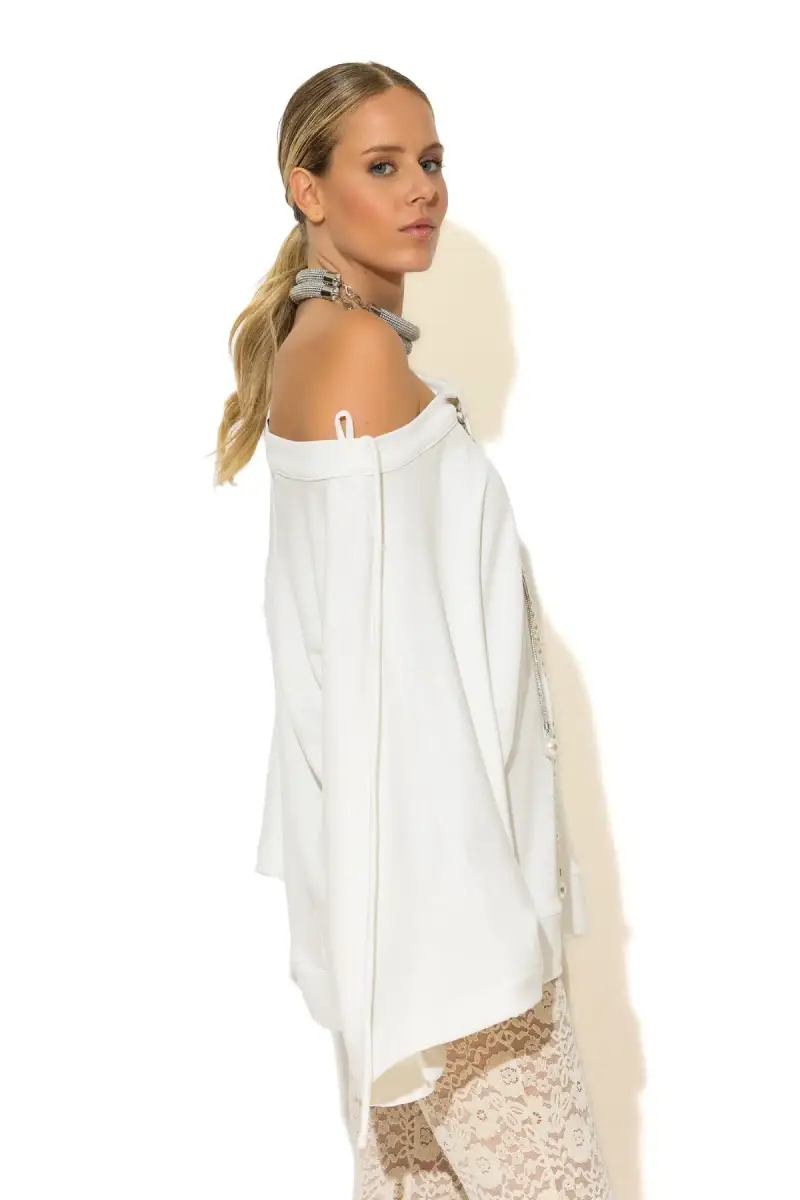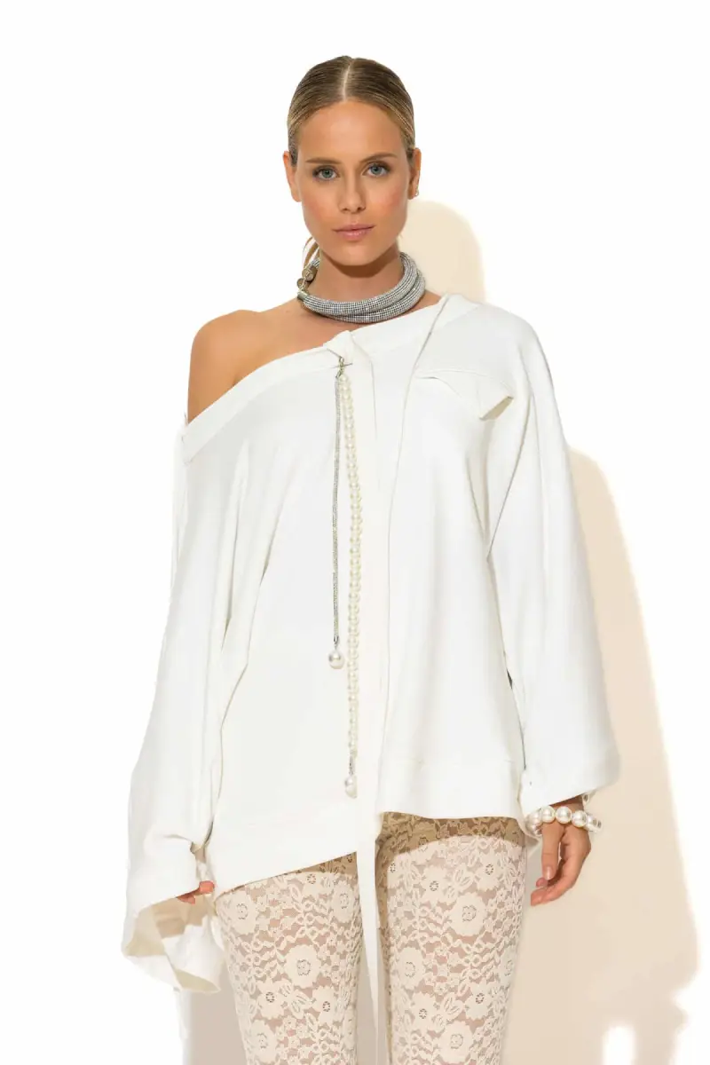 Τα μακριά μανίκια σε καμπάνα γραμμή δίνουν αίσθηση κίνησης και στυλ, ενώ η τσέπη στο στήθος προσθέτει casual χαρακτήρα χωρίς να αφαιρεί από την κομψότητα. Το πιο εντυπωσιακό στοιχείο είναι ο διακοσμητικός γιακάς, στολισμένος με περλέ λεπτομέρειες και κρυστάλλους με έντονη λάμψη, που μετατρέπει το sweatshirt σε statement κομμάτι.