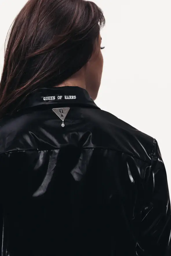 Στο πίσω μέρος, μια διακριτική λεπτομέρεια κάνει τη διαφορά: το εμβληματικό κέντημα Queen of Harns, το οποίο αποδίδεται με ακρίβεια και φινέτσα, αναδεικνύοντας τη μοναδικότητα του σχεδίου. Η υπογραφή ολοκληρώνεται με το ατσάλινο γράμμα Q, ένα στοιχείο που προσθέτει μεταλλική λάμψη και λειτουργεί ως κομψό σύμβολο ισορροπίας ανάμεσα στη δύναμη και την εκλέπτυνση.