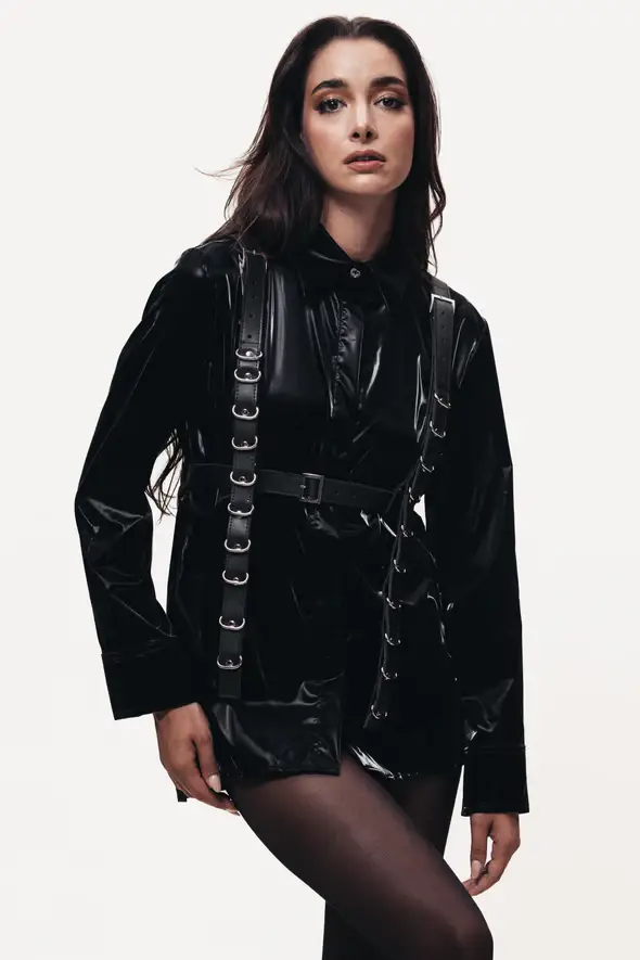 Μαύρο πουκάμισο με μακριά μανίκια, κατασκευασμένο από ρευστό ύφασμα με έντονη γυαλάδα που χαρίζει κομψότητα και δυναμισμό. Το ύφασμα αγκαλιάζει απαλά το σώμα, δημιουργώντας φυσική κίνηση και διακριτική λάμψη σε κάθε βήμα. Ο γιακάς έχει δομημένο σχήμα, προσφέροντας καθαρή, αρχιτεκτονική γραμμή που ισορροπεί άψογα ανάμεσα στο κλασικό και το σύγχρονο.